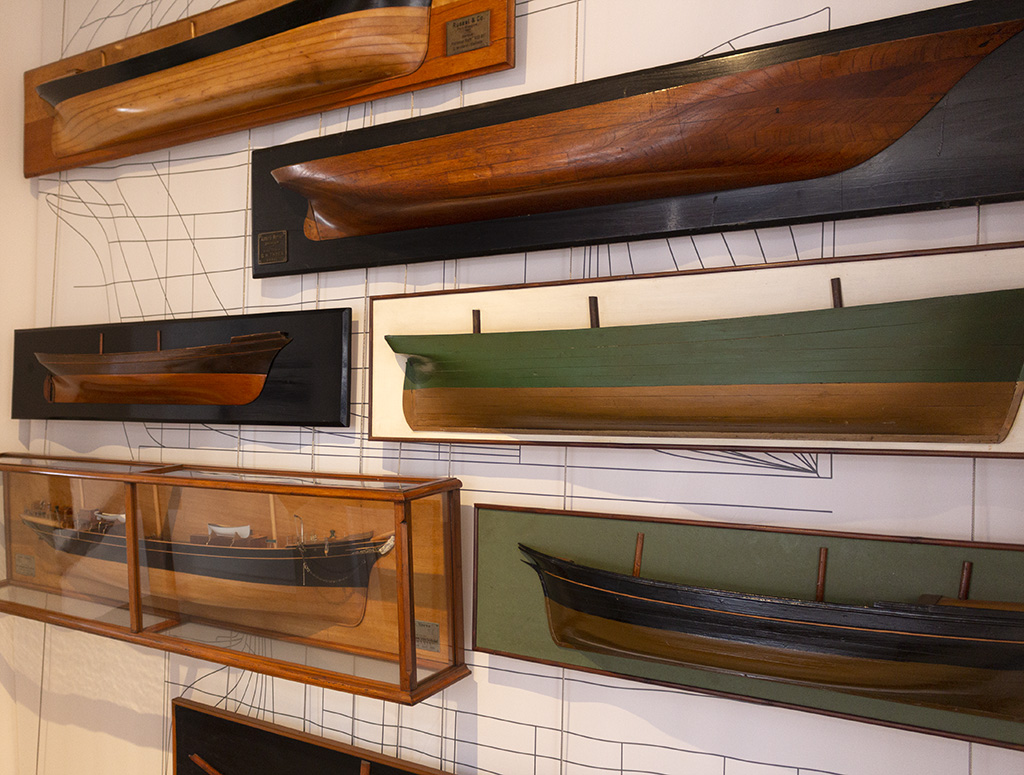 Die Geschichte der lokalen Werften hat eine Vielzahl von Halbmodellen hinterlassen, die im Telegraphen ausgestellt sind. Im Aufgang zum ersten Stock können Sie anhand solcher Modelle die Veränderung der Schiffsrümpfe im Laufe der Zeit nachvollziehen.