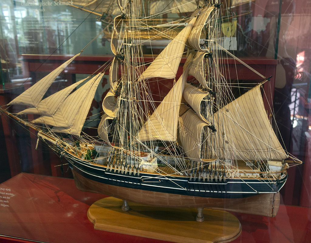 Bestaunen Sie eine Vielzahl von Schiffsmodellen der Schiffstypen der oldenburgischen Weserhäfen, vor allem der Schiffstypen Bark und Brigg. Darüber hinaus können Sie einige wunderschöne Modelle von Schiffen aus aller Welt entdecken, wie ein Modell des schwedischen Kriegsschiffes Vasa und weitere Exponate, wie ein Knochenschiff aus Elfenbein, Knochen und Walbarten.