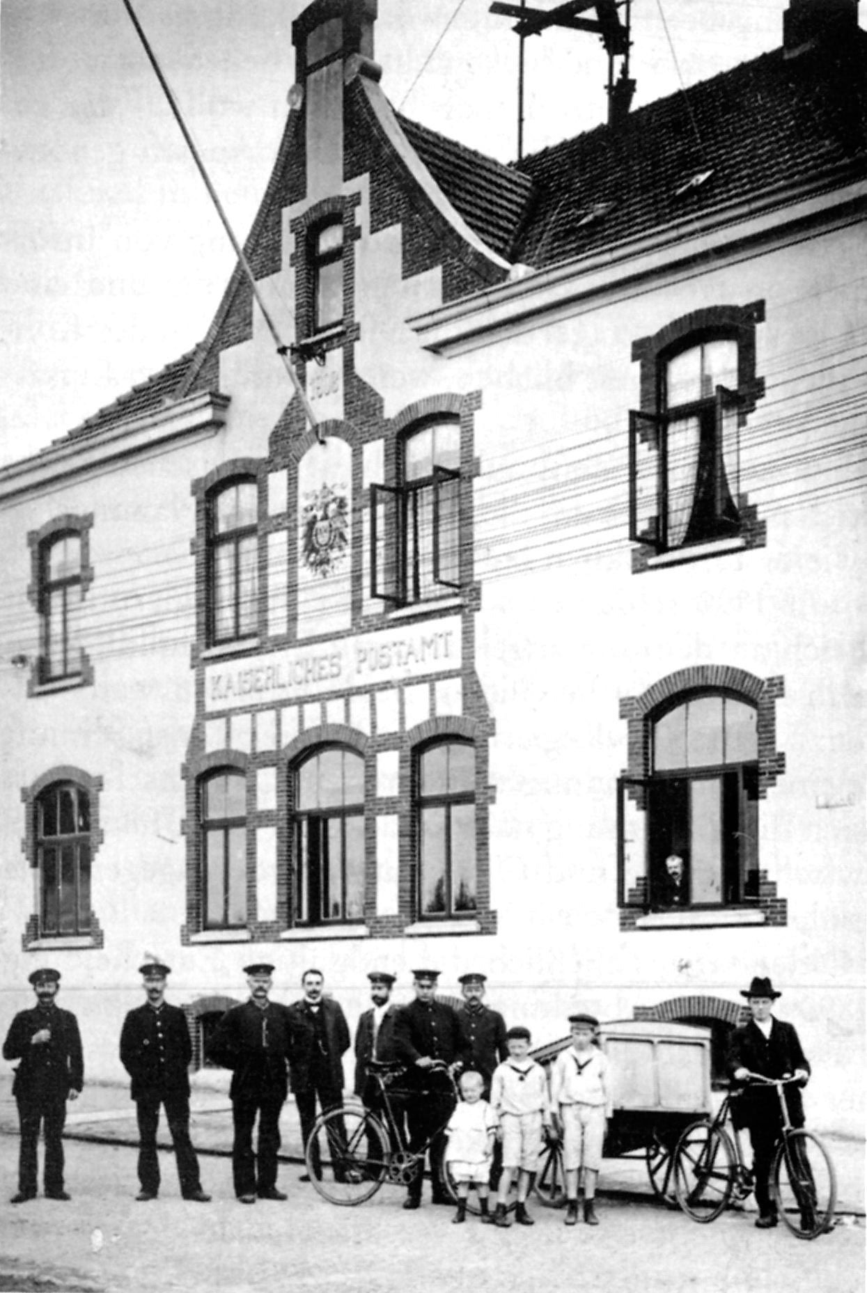 Dieses Bild aus unserem Archiv zeigt das Kaiserliche Postamt. Die Aufnahme stammt aus dem Jahr 1911. Nach Adolf Blumenberg sind neben den Postbeamten in ihren stattlichen Uniformen auch die drei Kinder des Postmeisters Bakker zu sehen, der selbst aus dem geöffneten Fenster des Erdgeschosses blickt. Das Gebäude entstand 1907. Zuvor war die Poststelle in Elsfleth teilweise bei Gastwirten oder in Privathäusern untergebracht. Die gleichfalls abgebildete Ausstattung mit Fahrrädern und Postkarren lässt auf einen hohen, körperlichen Einsatz bei Wind und Wetter – sowie über Stock und Stein schließen, denn viele Straßen und Wege waren nicht wie heute asphaltiert.