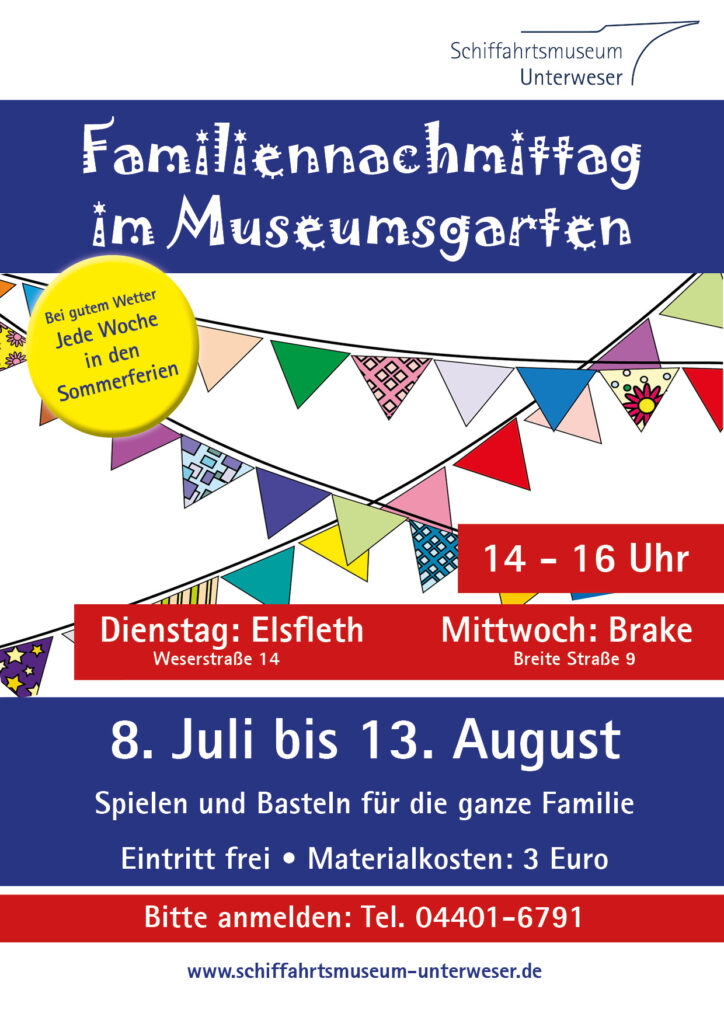 Während der Sommerferien lädt das Schiffahrtsmuseum Unterweser Familien mit Kindern jede Woche zu zwei Spielenachmittagen in die Museumsgärten ein. In Elsfleth ist der Museumsgarten jeden Dienstag und in Brake jeden Mittwoch, jeweils von 14 bis 16 Uhr geöffnet. Los geht es am Dienstag, 8. Juli in Elsfleth. Einen Tag später, am Mittwoch, 9. Juli, findet der erste Familiennachmittag in Brake statt.