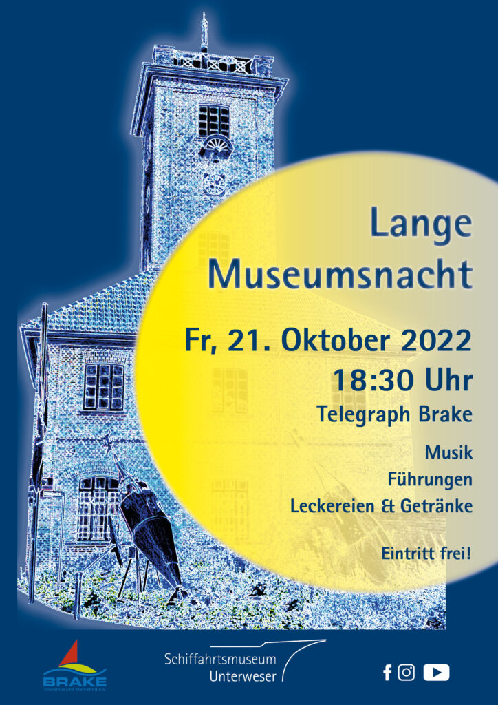 Musik, Führungen, Getränke und Leckereien erwarten Sie am Freitag, 21. Oktober ab 18:30 Uhr bei der Langen Museumsnacht im Telegraph Brake. Für große und kleine Gäste gibt es viel zu entdecken. Genießen Sie einen stimmungsvollen Abend im Museum. Der Eintritt ist frei!