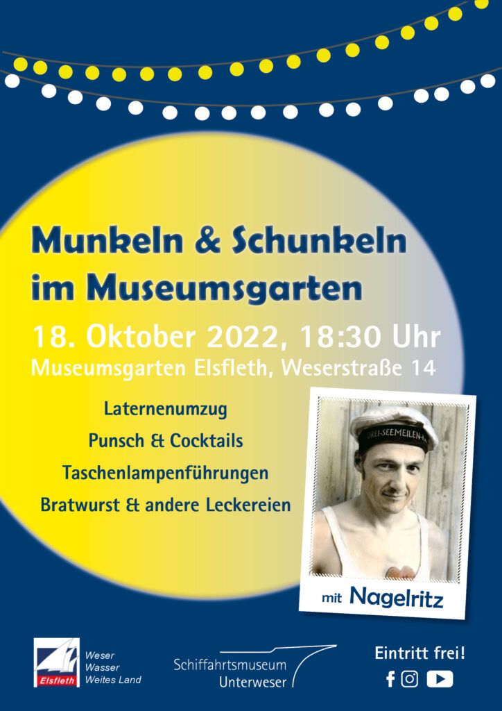 Das Touristikbüro der Stadt Elsfleth und das Schiffahrtsmuseum Unterweser laden am Dienstag, 18. Oktober ab 18:30 Uhr zum Munkeln & Schunkeln mit Nagelritz in den Museumsgarten Elsfleth ein.