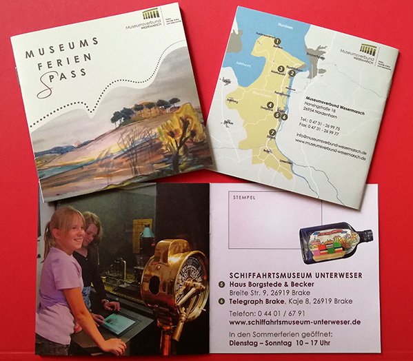 Mit dem kostenlosen Museums-Ferienpass gehen Kinder auf Entdeckertour durch die Wesermarsch. Von Fedderwardersiel bis Elsfleth haben Grundschulkinder in den Sommerferien freien Eintritt in sieben Museen, die sich zum Museumsverbund Wesermarsch zusammengeschlossen haben. Neben dem Schiffahrtsmuseum mit seinen drei Häusern in Brake und Elsfleth sind das Handwerksmuseum Ovelgönne, die Moorseer Mühle, das Museum Nordenham und das Nationalpark-Haus Museum Fedderwardersiel dabei. Den Pass gibt es kostenlos an allen Museumskassen. In jedem Haus können die Kinder einen Stempel sammeln. Der Museums-Ferienpass wird gefördert durch den Landkreis Wesermarsch.