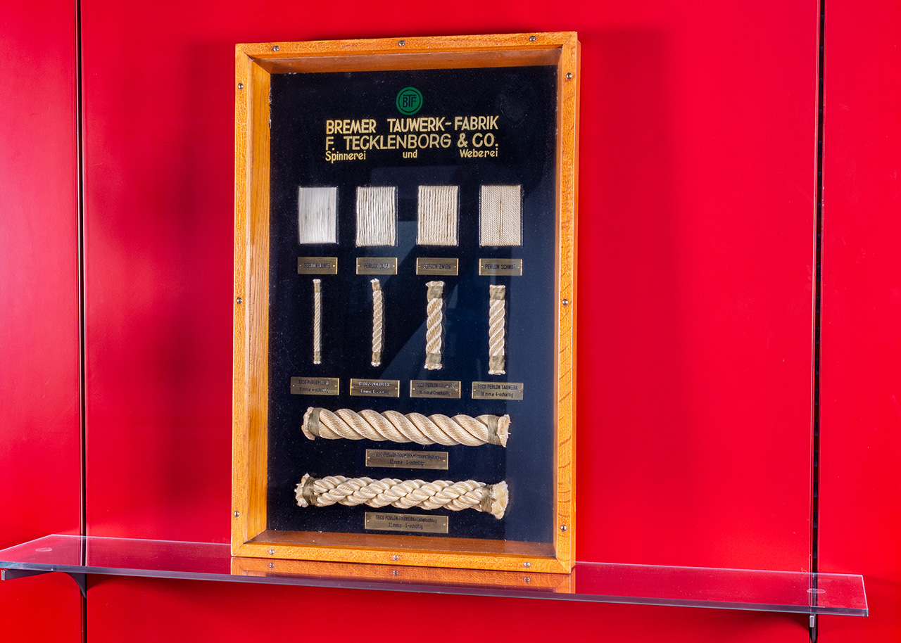 Lunte, Schnur, Leine, Trosse – wie entsteht aus Kunststofffasern ein ordentlicher Festmacher? Darüber gibt die Übersicht in diesem Schaukasten Auskunft. Hergestellt wurde er von der „Bremer Tauwerk-Fabrik F. Tecklenburg & Co.“, die hier schon als „Spinnerei und Weberei“ firmiert. Das gibt einen Hinweis auf die zeitliche Einordnung des Objekts in die Zeit um 1950.